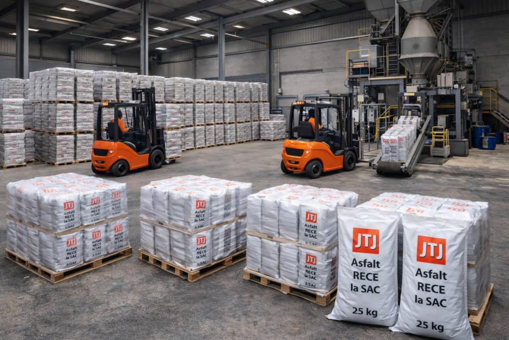 Hală de producție asfalt la rece JTJ – interiorul unității noastre de producție, unde asfaltul la rece este fabricat, ambalat și paletizat în saci de 25 kg. Paletii cu produs finit sunt manipulați cu stivuitoare, iar linia de producție asigură un flux constant, controlat, pregătit pentru livrare rapidă către primării, firme de construcții și lucrări de întreținere drumuri din România.